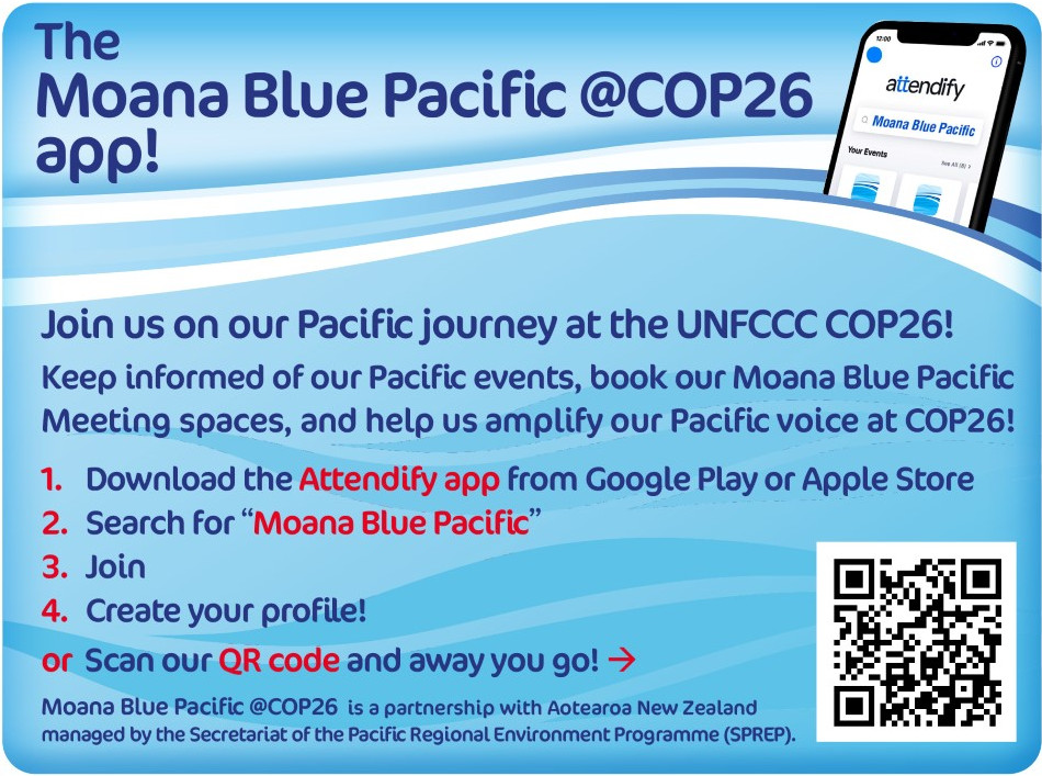 To find out more about what is being done to highlight the Pacific islands at COP26 can download the APP by scanning the QR code or following the instructions above. On this APP you will find the Pacific High Level Champions for COP26, the #Flexfor1pt5 campaign, Moana Blue Pacific side events, Moana Blue Pacific Office, Moana Blue Pacific Meeting Space, Mana Moana Pacific Voices and further news about the Pacific