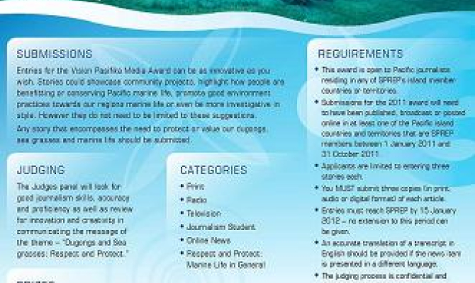The Vision Pasifika Media award to recognise and pay tribute to Pacific reporters for their role in raising awareness on environment issues has expanded to include an online news category. There is also a special category for 2011 for news items submitted on the conservation of marine life of general.
