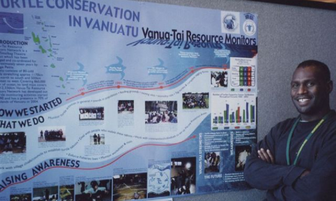 George Petro is a turtle conservation officer with Wan Smol Bag, which has been instrumental in the strengthening awareness of turtle conservation in Vanuatu that initially began with a plan that toured the villages in Vanuatu. This led to a network of Village Turtle Monitors, now called Vanua-Tai Resource Monitors, who currently number over 500 and cover over 80% of the country.